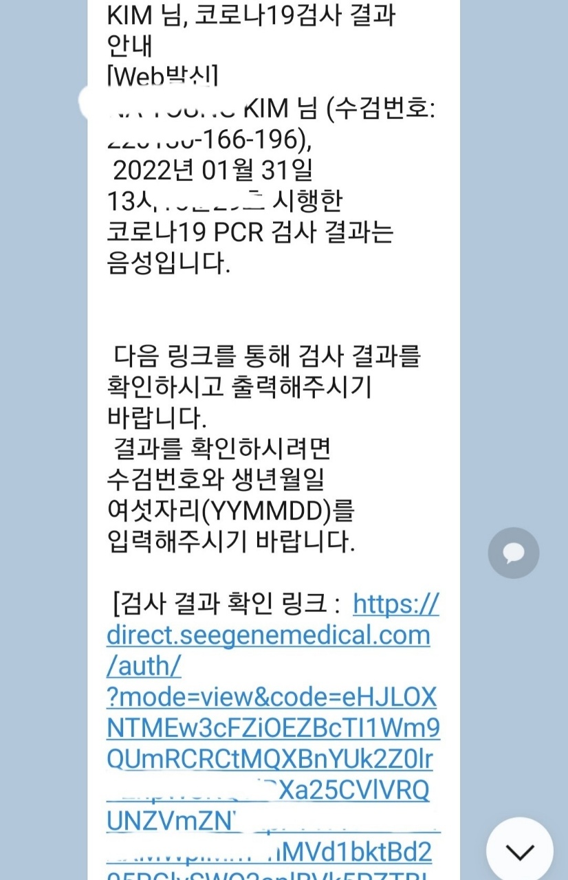 13시에 검사를 받았고 17시 조금 넘은 시간에 카톡으로 문자가 왔다. 링크를 타고 들어가면 PCR 영문 확인서 출력이 가능하다.